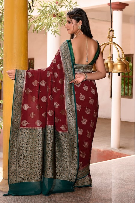 Buy_Naaritva India_Maroon Crepe Zari Hand Woven Cocoa Brown Banarasi Saree With Running Blouse _Online_at_Aza_Fashions
