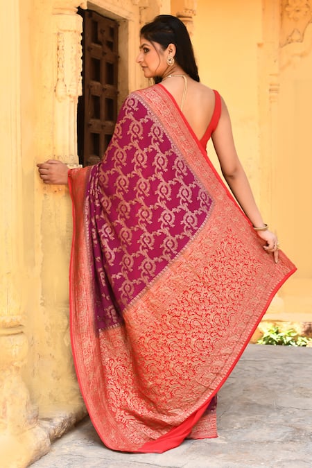 Hot pink saree featuring handwoven zari work with a running blouse piece.