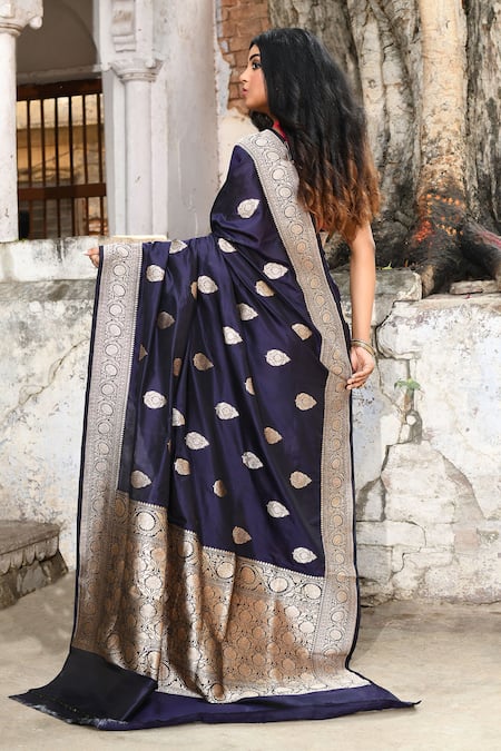Buy_Naaritva India_Navy Zari Handwoven Work Blue Banarasi Saree With Running Blouse