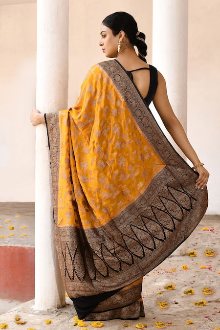 Yellow Crepe, Chiffon, Silk Handwoven Work Banarasi Saree With Running Blouse