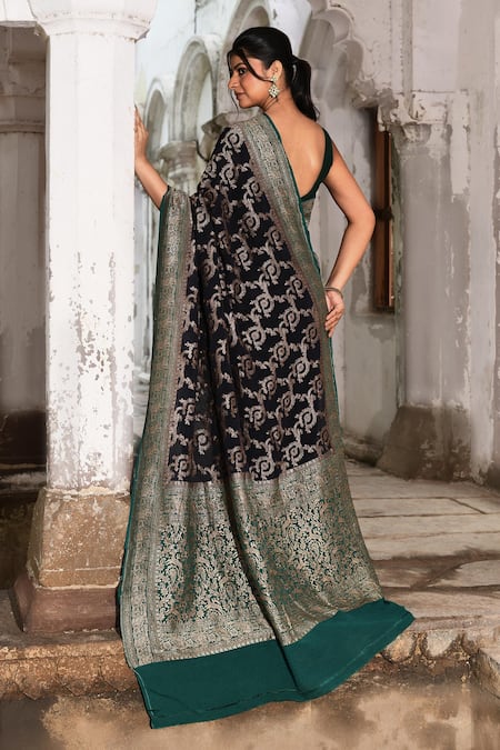 Buy_Naaritva India_Navy Crepe, Silk Zari Blue Handwoven Banarasi Saree With Running Blouse _at_Aza_Fashions