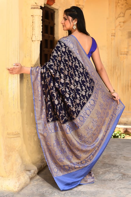 Buy_Naaritva India_Navy Crepe, Chiffon, Silk Blue Handwoven Banarasi Saree With Running Blouse _Online_at_Aza_Fashions