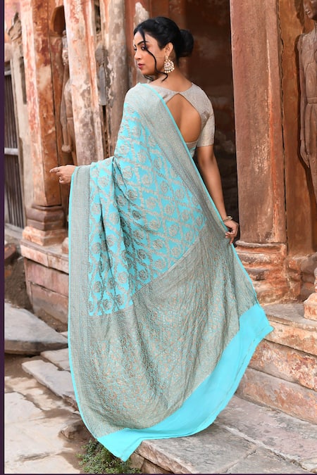 Teal green saree crafted from crepe chiffon silk featuring handwoven zari work. Comes with a running blouse.