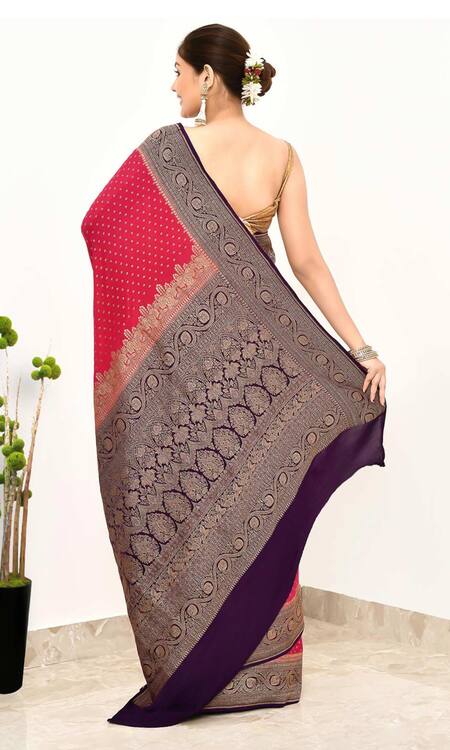 Pink saree featuring zari woven border and pallu with vine, scallop vine, and butti patterns