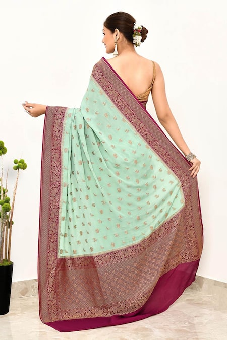 Green saree with contrast border & pallu featuring zari woven animal, geometric motifs & animal butti. Comes with running blouse fabric.
