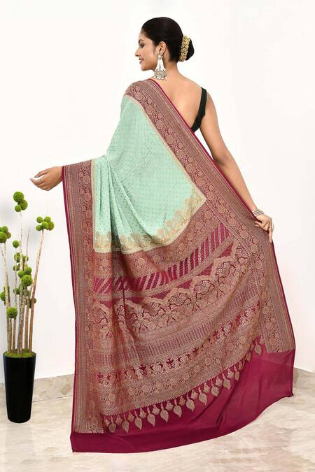 Green saree with contrast border and pallu featuring zari woven floral vine motifs and butti patterns. Comes with running blouse fabric.