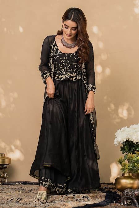 Black Cotton, Chanderi And Organza Round Cape & Gharara Set