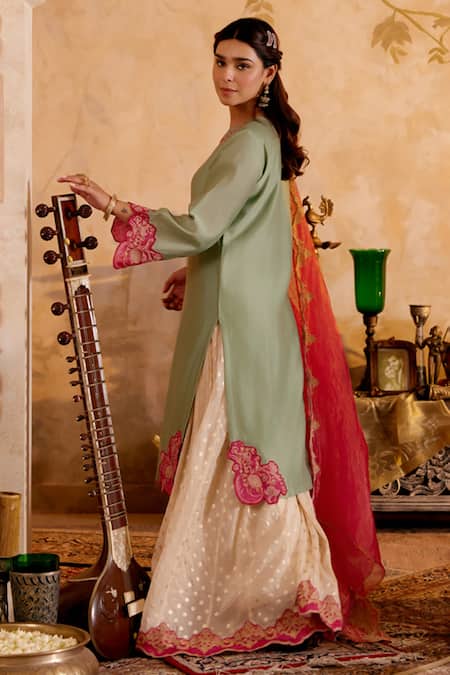 Green chanderi kurta featuring hand crafted embroidery on the neck and zari motifs on sleeves and hem. Paired with an off-white sharara with gold zari border and a tissue dupatta with gold stripes.