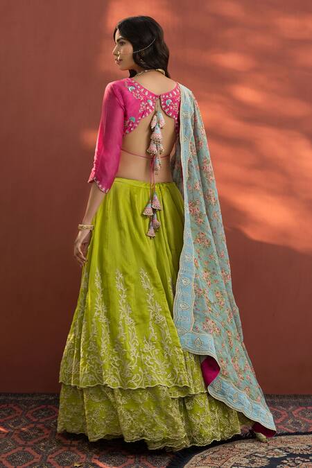 Lime green layered lehenga with floral embroidered motifs & side tassel tie-up. Paired with embroidered blouse & floral printed, embroidered dupatta. The lehenga comes with an attached can can.