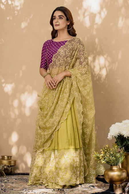 Lime green lehenga with layered hemline and embroidered trim. Comes with embroidered purple blouse and dupatta.