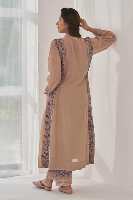 Beige Cotton, Chanderi Lace, Embroidery Mandarin Collar Kurta Pant Set
