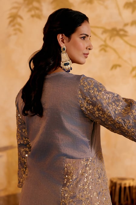 Blue chanderi tissue kurta featuring embroidered jaal in gold zari sequin work on the sides and fully embroidered A-line sleeves. Paired with blue pants adorned with heavy gold zari sequin embroidery at the hem and an organza dupatta with gold zari sequin border.