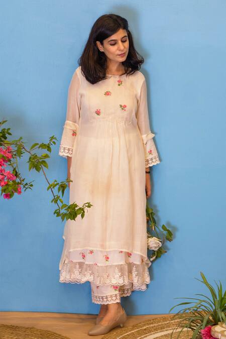 Off-white straight kurta with embroidered floral motifs on yoke. Comes with pant and sheer dupatta.