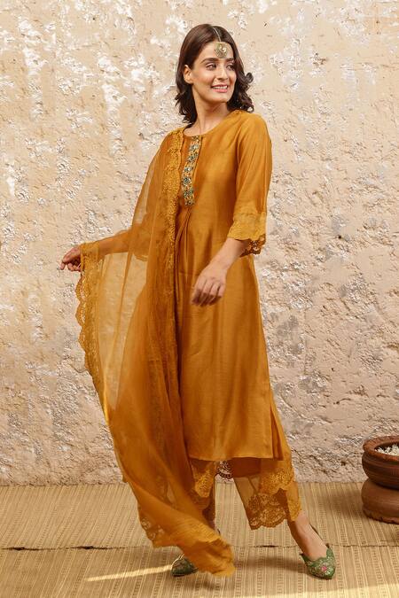 Mustard kurta with sequin embroidered floral motifs on yoke. Comes with inner, pant and sheer dupatta.