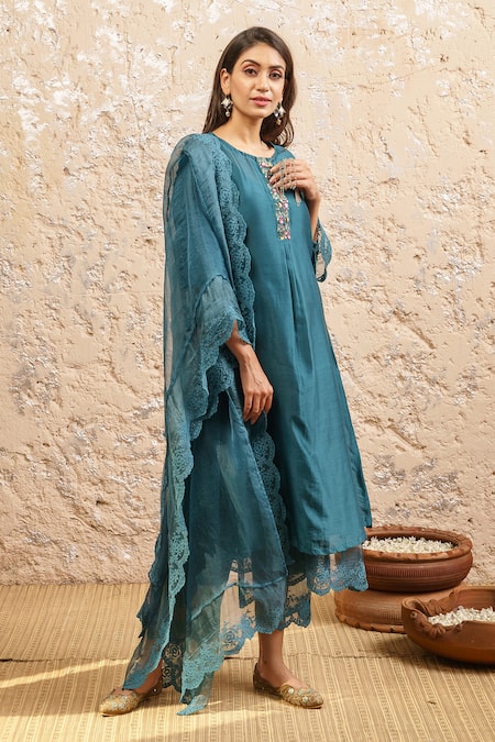Teal kurta with sequin embroidered floral motifs on yoke. Comes with inner, pant and sheer dupatta.