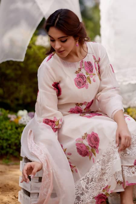 Pink kurta featuring a rose field print with pleated detailing. Paired with a pant, an inner, and a floral lace border embroidered dupatta.