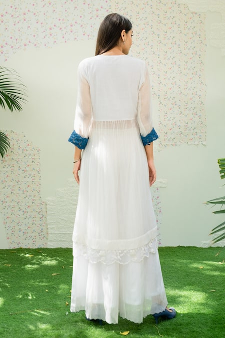 White Cotton, Organza, Chanderi Thread Work High Neck Scallop Hem Kurta Set