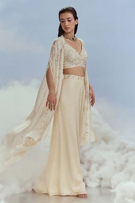 Beige chiffon cape featuring floral, beads, and thread embroidery. Paired with a satin palazzo and an organza crop top.