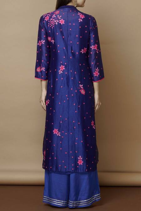 Blue Chanderi Kurta Mandarin Collar Inner Round Embroidered