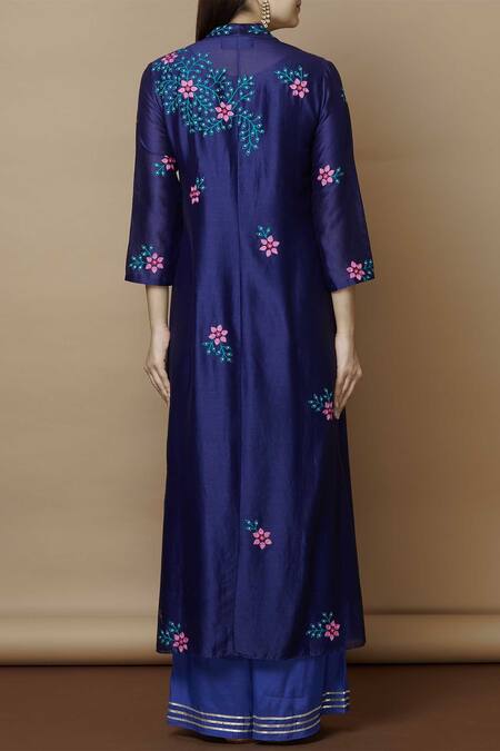 Blue long kurta with placement floral motif work. Comes with inner slip.