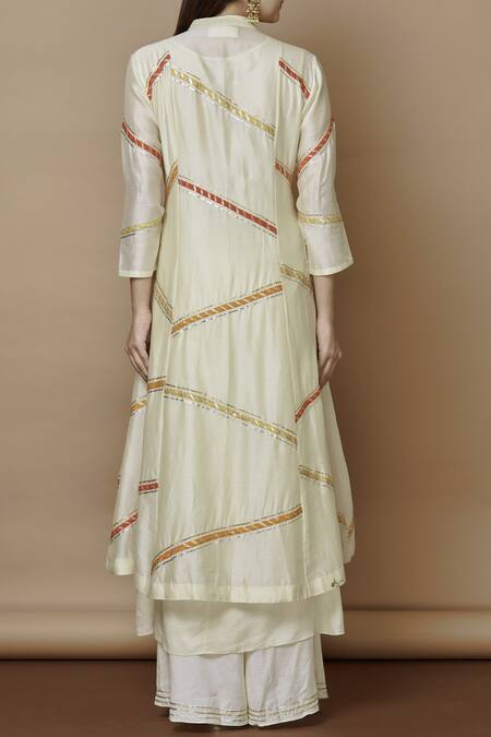 Ivory jacket-style kurta with all over multi-colored gota stripes. Comes with inner top & palazzos.