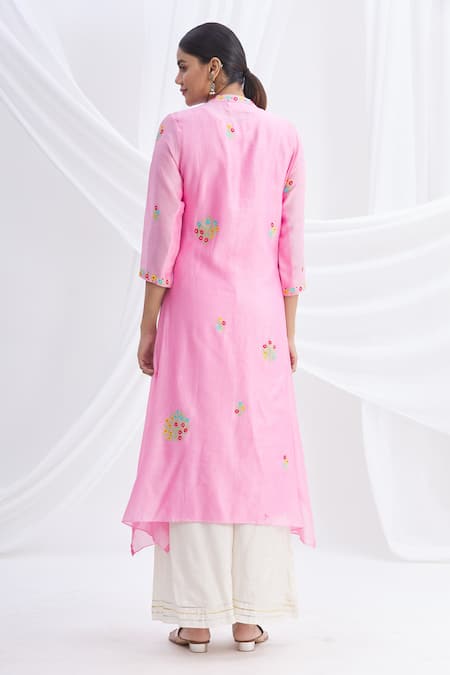 Baby pink kurta with floral embroidered motifs, front potli placket & asymmetric hem.
