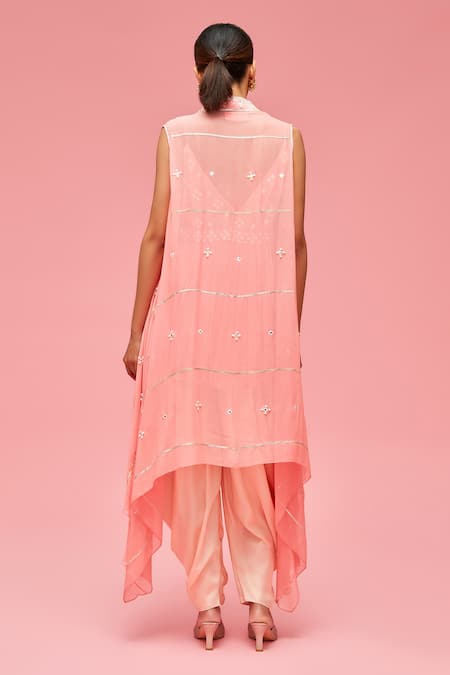 Peach gelato cape hand crafted & embellished with tonal Bhuj embroidery. Paired with pleated mirrorwork top & satin dhoti pant.