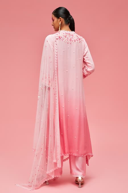 Baby pink, rose pink asymmetric anarkali with floral embroidery & scallop hem. Paired with floral embroidered, scallop hem tulle dupatta & palazzo.