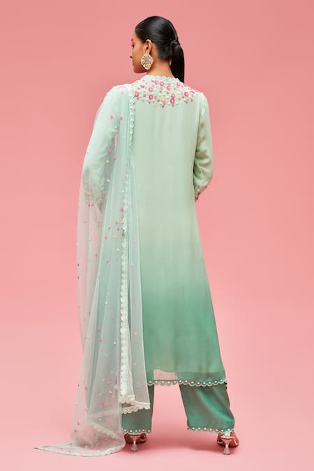 Ombre mint jade asymmetric anarkali with floral embroidery & scallop hem. Paired with floral embroidered, scallop hem tulle dupatta & palazzo.