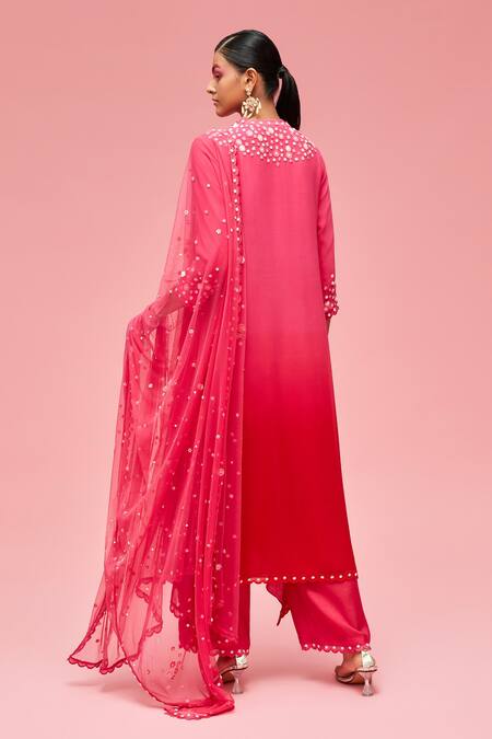 Red, pink asymmetric kurta with floral embroidery & scallop hem. Paired with floral embroidered, scallop hem tulle dupatta & palazzo.
