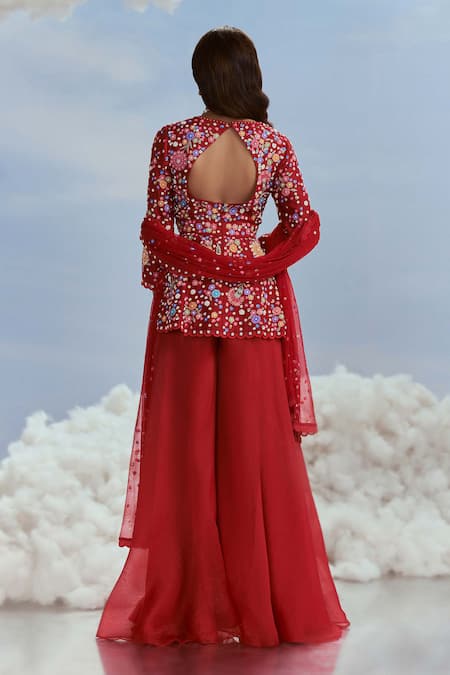 Red Organza, Tulle Embroidery, Sequins, Beads Floral Peplum Top Sharara Set