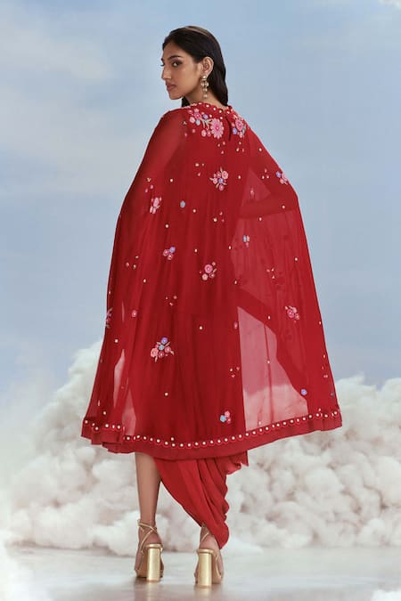 Red cape featuring floral, bead, sequin, and thread embroidery. Paired with a plain draped skirt and inner slip.