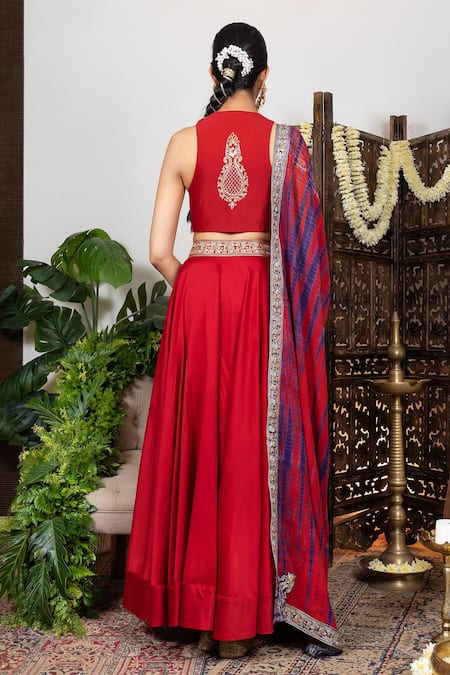 Red lehenga in chanderi with embroidered waistband. Comes with sleeveless embroidered chanderi blouse & embroidered dupatta in tie-dye.