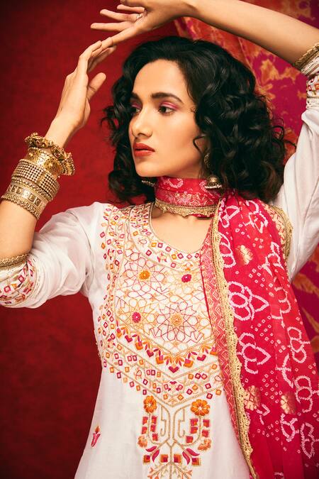 White kurta with all-over floral motif thread work & side slits. Comes with straight pants & red lace trim border dupatta.