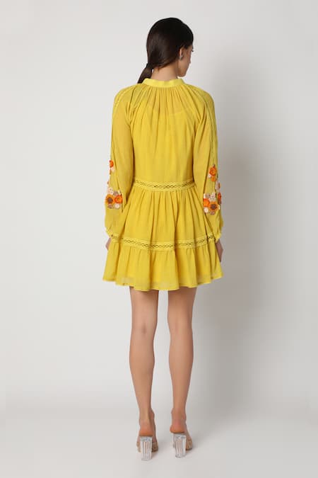 Yellow dress with crotchet flower on the sleeves and mandarin collar.
