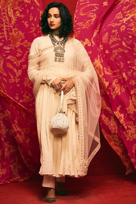 Peach anarkali with lace trim hemline. Comes with embroidered dupatta & pants.