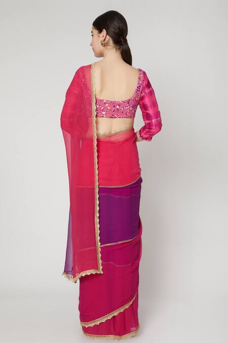 Pink purple saree with lace border & colorblock panel. Paired with inner skirt.