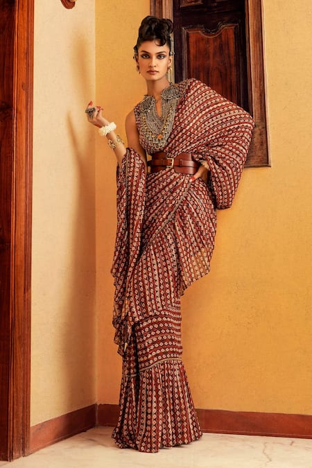 Brown saree with geometric print & embroidered edges. Paired with blouse.