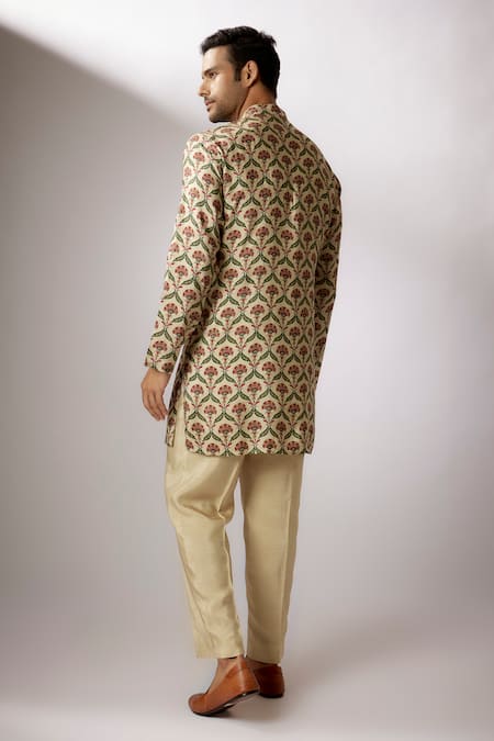 Beige kurta featuring an all-over Mughal floral print with a mandarin neckline and full sleeves. Paired with a matching pant in a straight silhouette.