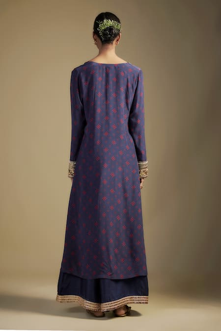 Navy blue kurta featuring a V-neckline and intricate embellishments. Paired with a matching palazzo and a georgette dupatta for a complete look.