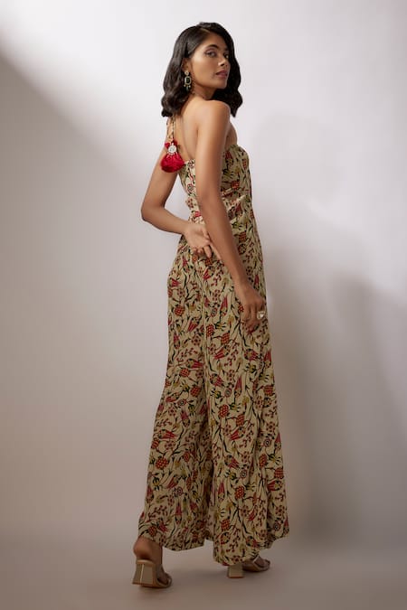 Beige Crepe Tassels Halter Neck Printed Tie-up Jumpuit