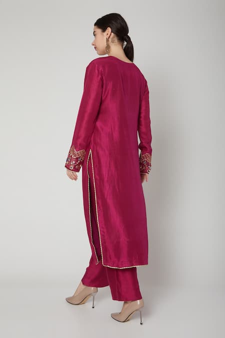 Magenta kurta with floral embroidered motifs. Paired with pant & dupatta.