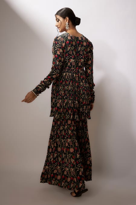 Navy blue printed kurta in crepe fabric featuring zardosi work on the neck and cuffs. Paired with a matching sharara pant and a net scallop trimmed dupatta with sequin and cutwork embroidery.