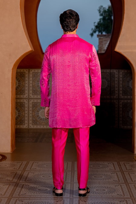 Hot pink kurta featuring kasab and zari embroidery. Paired with matching hot pink pant made from Chanderi and shimmer fabric.