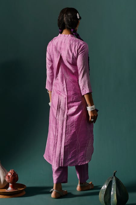 Purple silk kurta featuring a bandhani maze pattern with a center pleat and three-quarter sleeves. Paired with coordinating solid pants.
