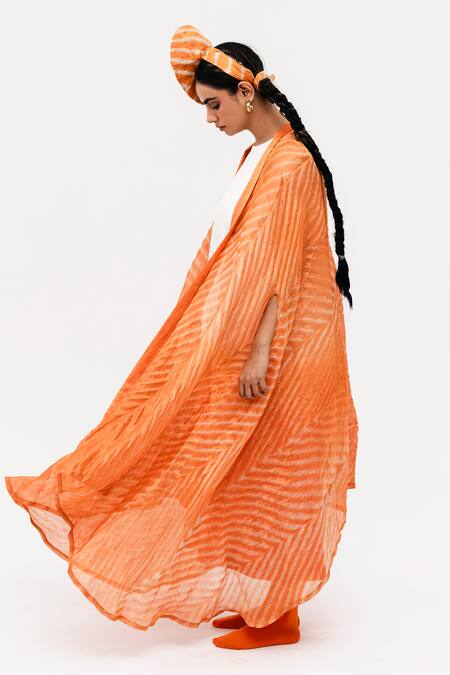 Orange Silk, Linen Round Khari Ombre Shaded Dress With Asymmetric Arashi Cape