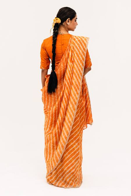 Orange linen tissue saree featuring an all-over leheriya pattern with mirror hand work on the pallu and border. Paired with a half sleeves high round neck blouse adorned with mirror hand embroidery.