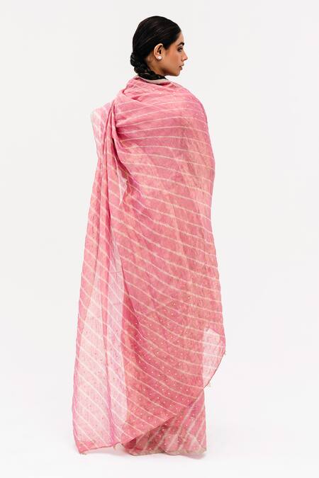 Pink linen tissue saree featuring an all-over leheriya pattern and mirror hand work on the pallu and border. Paired with an unstitched blouse piece.
