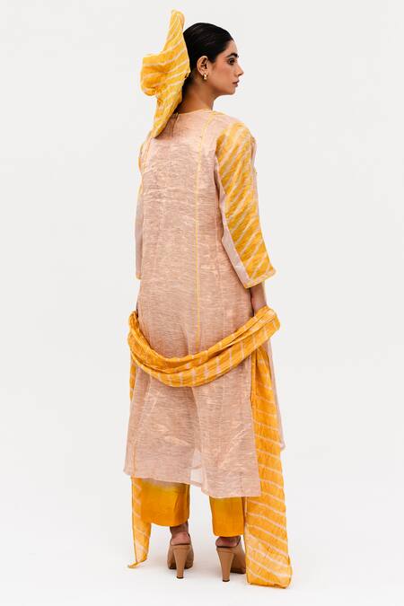 Yellow full sleeves straight kurta in linen tissue featuring mirror bloom embroidery on the yoke and leheriya detailing on the sleeves. Paired with an ombre silk pant and a matching leheriya pattern dupatta.