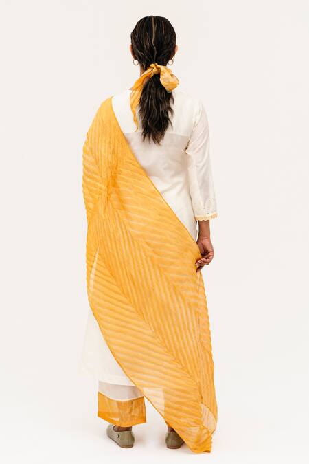Off white straight silk kurta with three fourth sleeves and V neck featuring mirror droplet embroidery on the yoke and hem. Paired with a silk pant and a yellow arashi linen tissue dupatta.